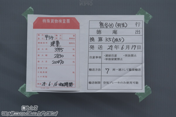 13108Fの特殊貨物検査票です。 (2017年6月19日 羽生にて) |